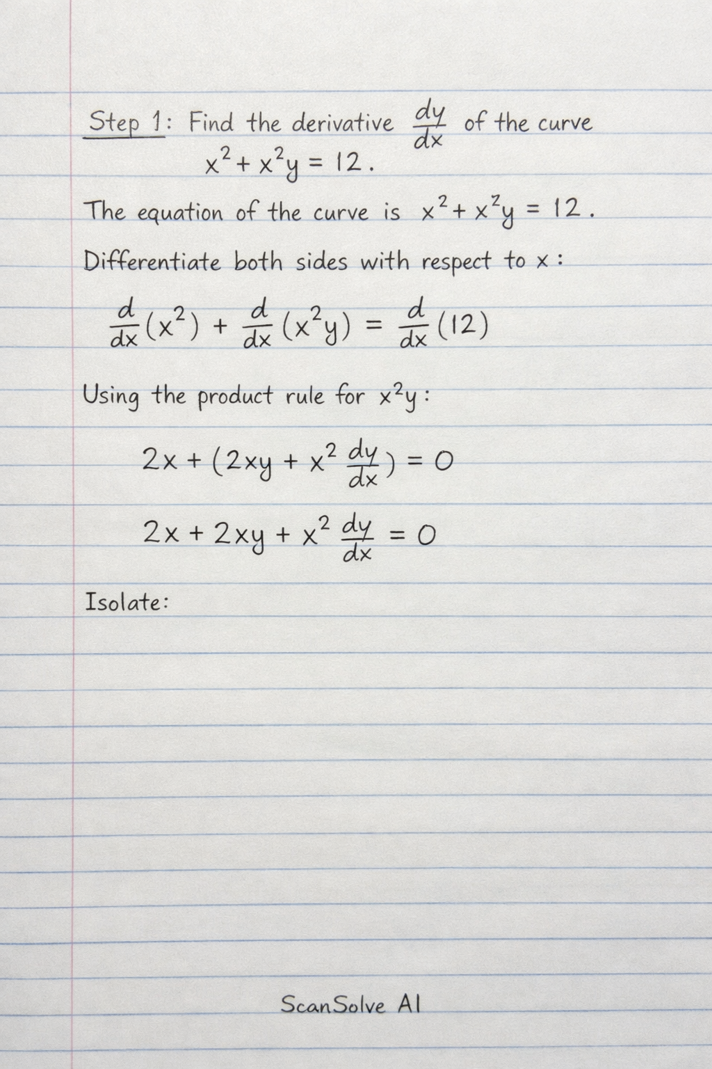 Step 1: Find the derivative dxdy of the curve x2+x2y=12.