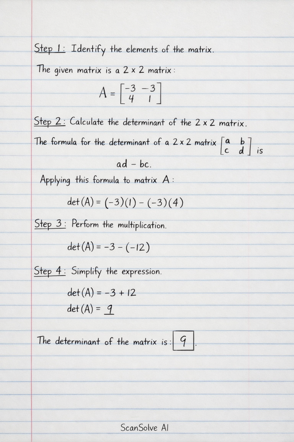 det(A)=(−3)(1)−(−3)(4)