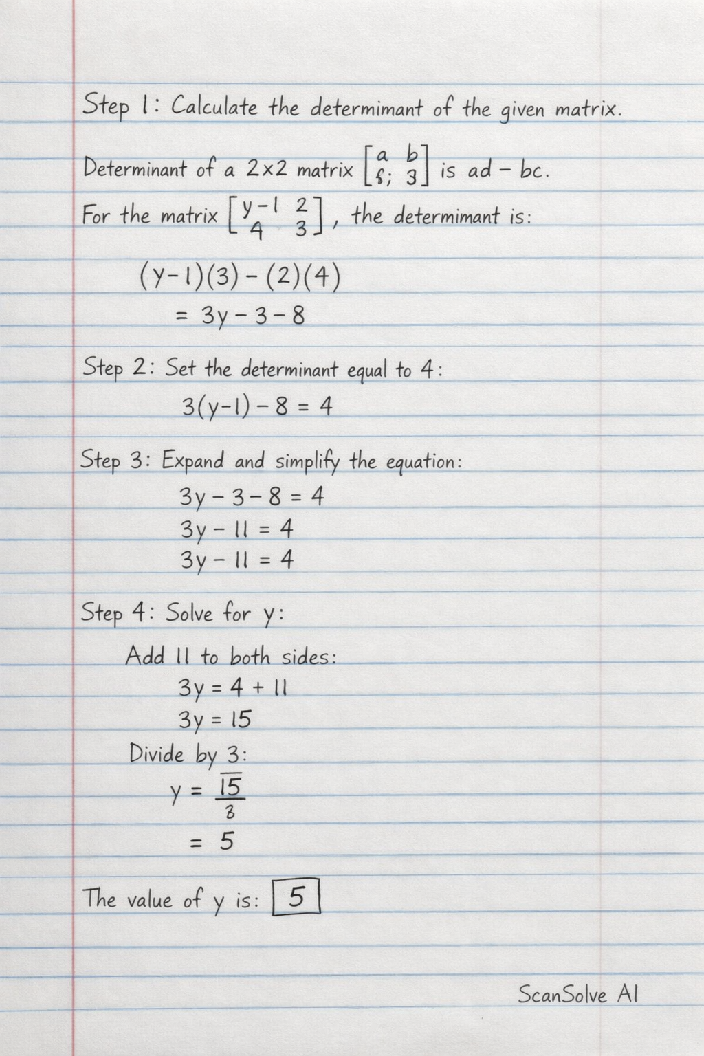 For the given matrix [yβ14β23β], the determinant is: