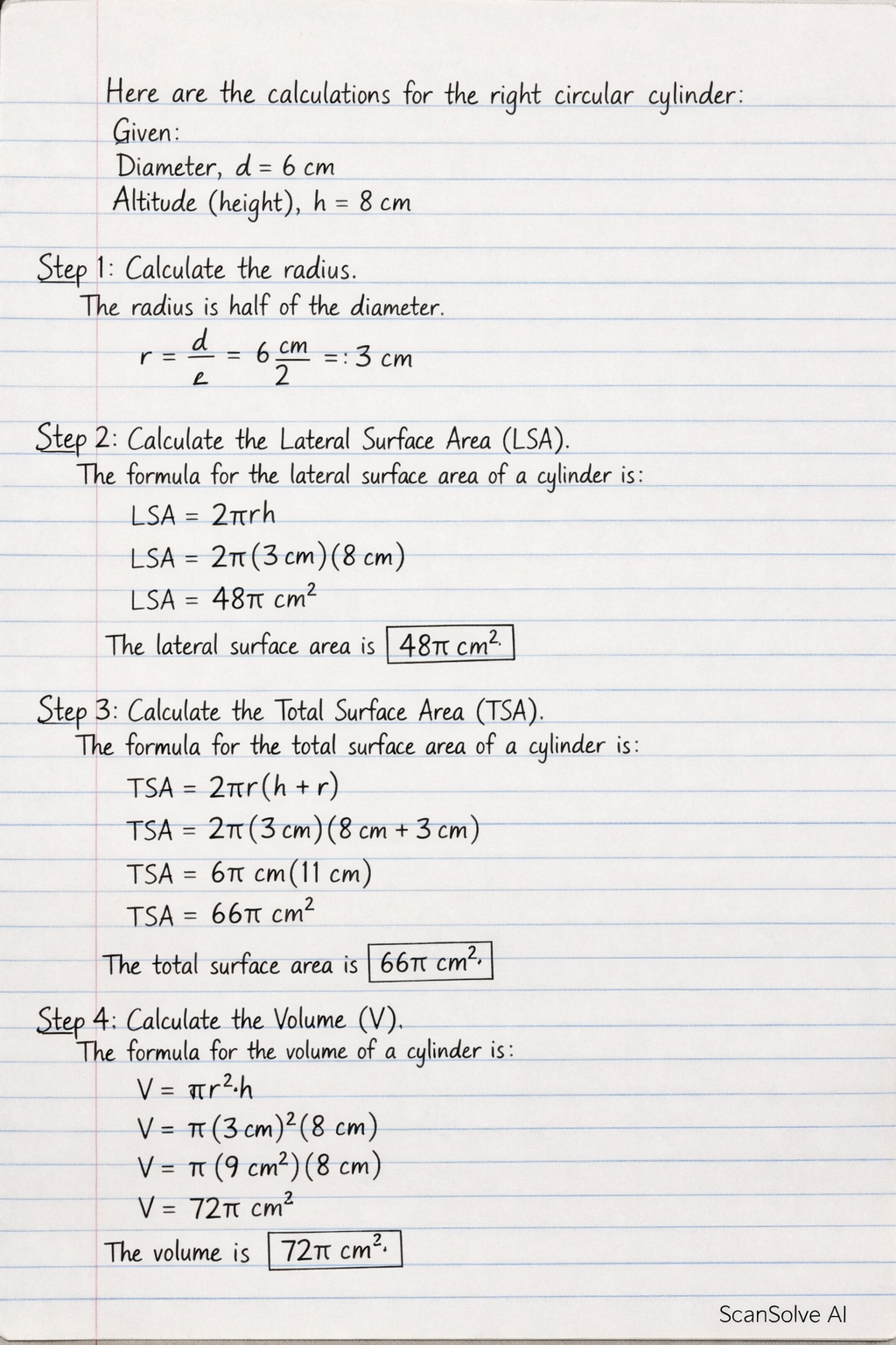 Step 2: Calculate the Lateral Surface Area (LSA). The formula for the lateral surface area of a cylinder is . The lateral surface area is .