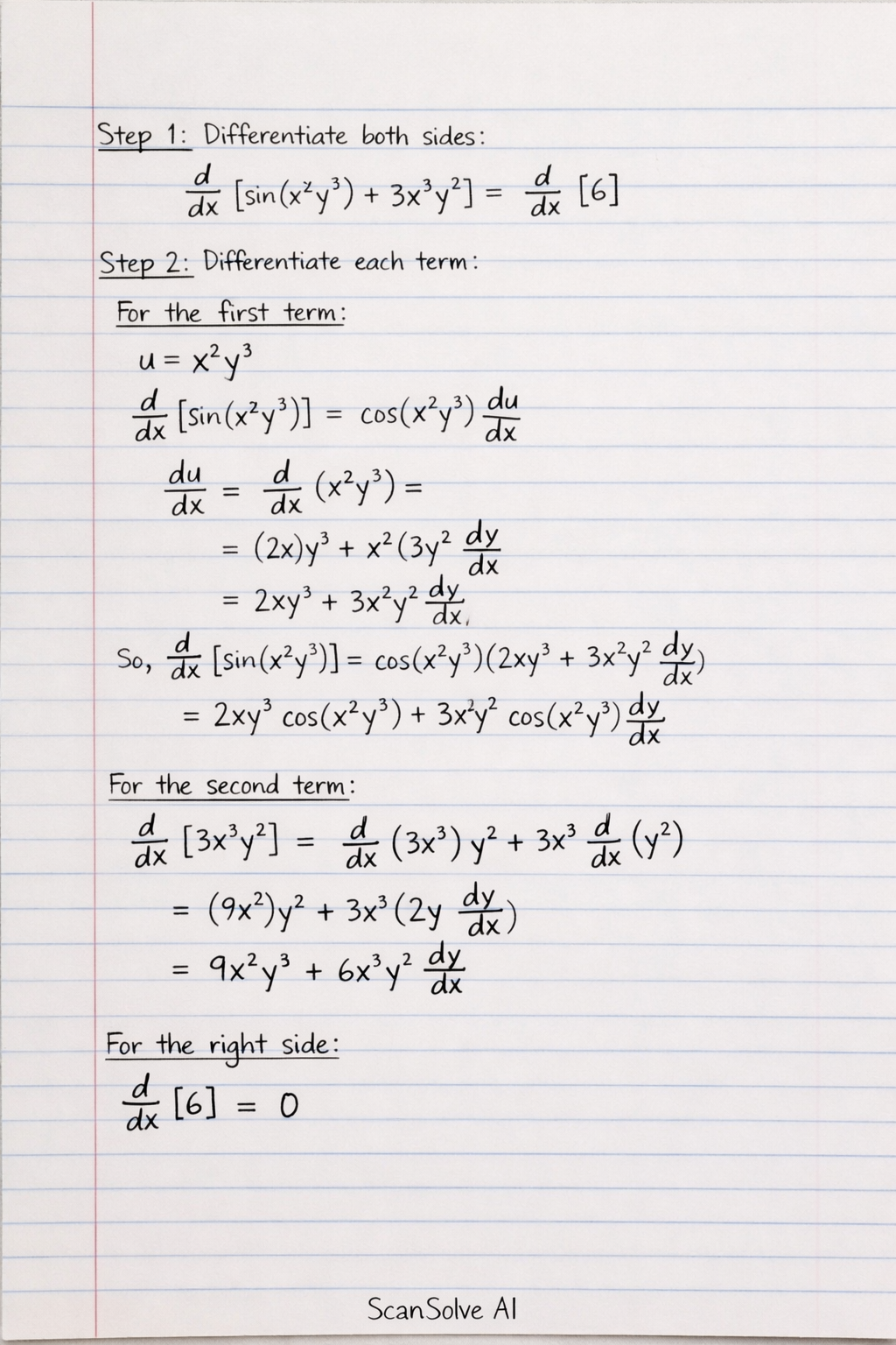 Apply the chain rule. Let u=x2y3. Then dxd[sin(u)]=cos(u)dxdu.
