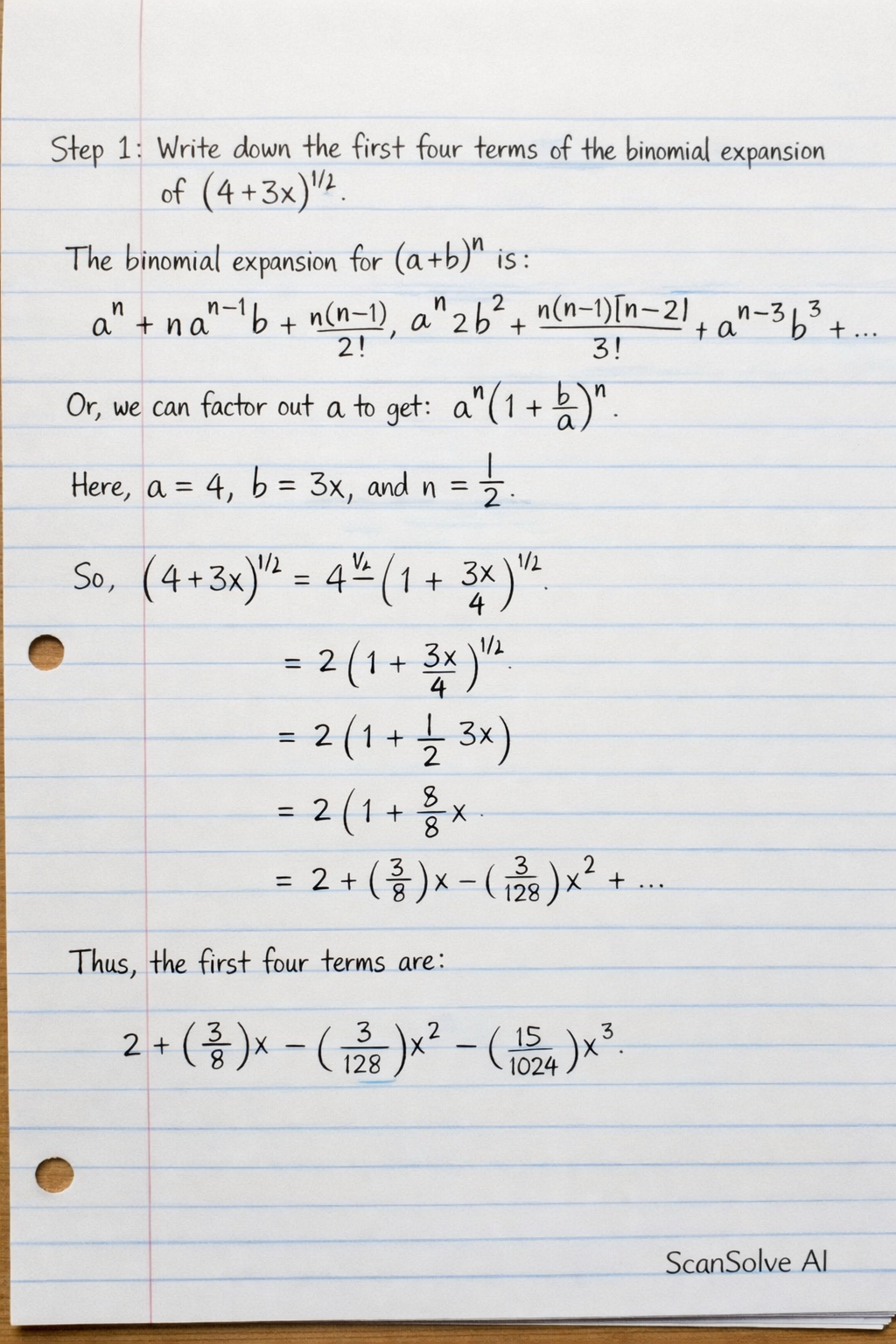 Write down the first four terms of the binomial expansion of (4+3x)^(1)/(2).