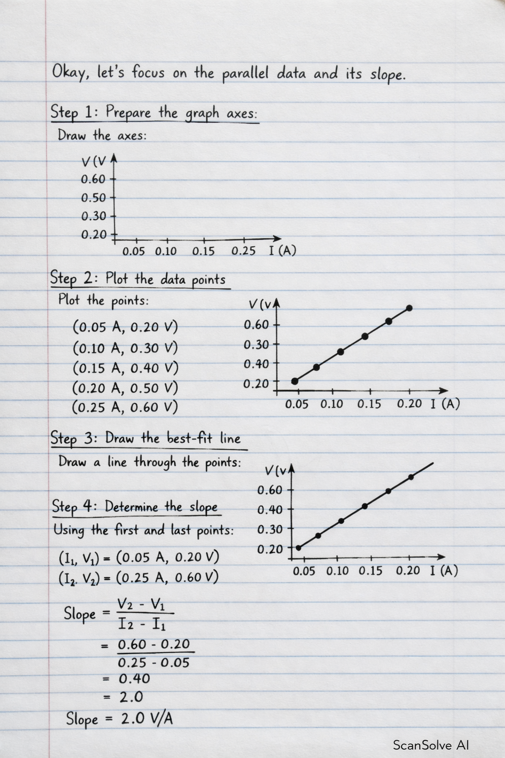 Okay, let's focus on the parallel data and its slope. Graph for Parallel Data Step 1: Prepare the graph axes Draw a horizontal axis (x-axis) for Current I (in Amperes, A) and a vertical axis (y-axis) for Voltage V (in Volts, V).