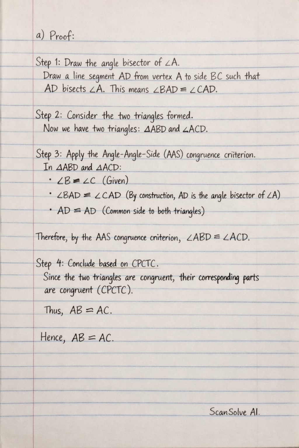 Step 3: Apply the Angle-Angle-Side (AAS) congruence criterion.