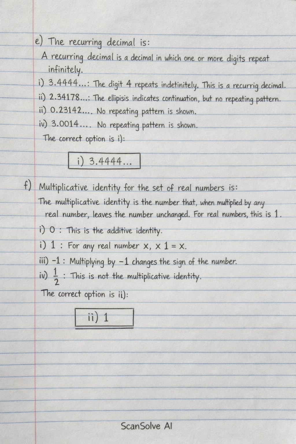 f) Multiplicative identity for the set of real numbers is: The multiplicative identity is the number that, when multiplied by any real number, leaves the number unchanged. For real numbers, this is .