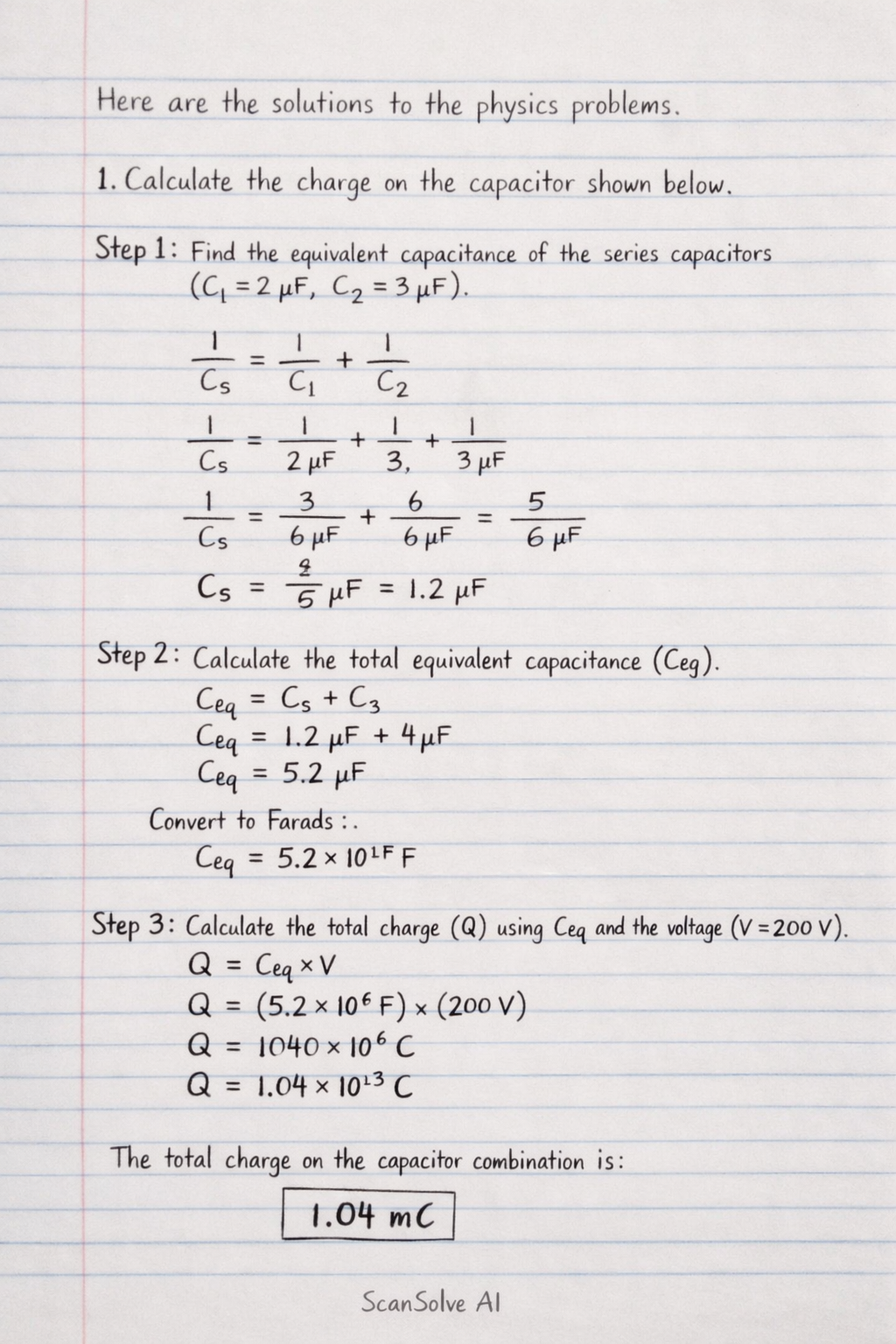 Step 3: Calculate the total charge () using the total equivalent capacitance and the supply voltage (). The total charge on the capacitor combination is .