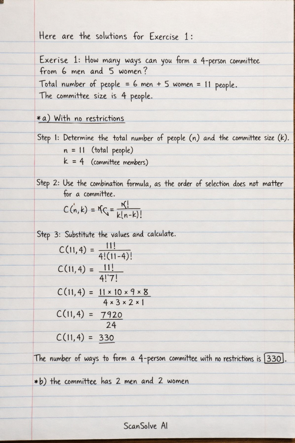 Exercise 1: How many ways can you form a 4-person committee from 6 men and 5 women?