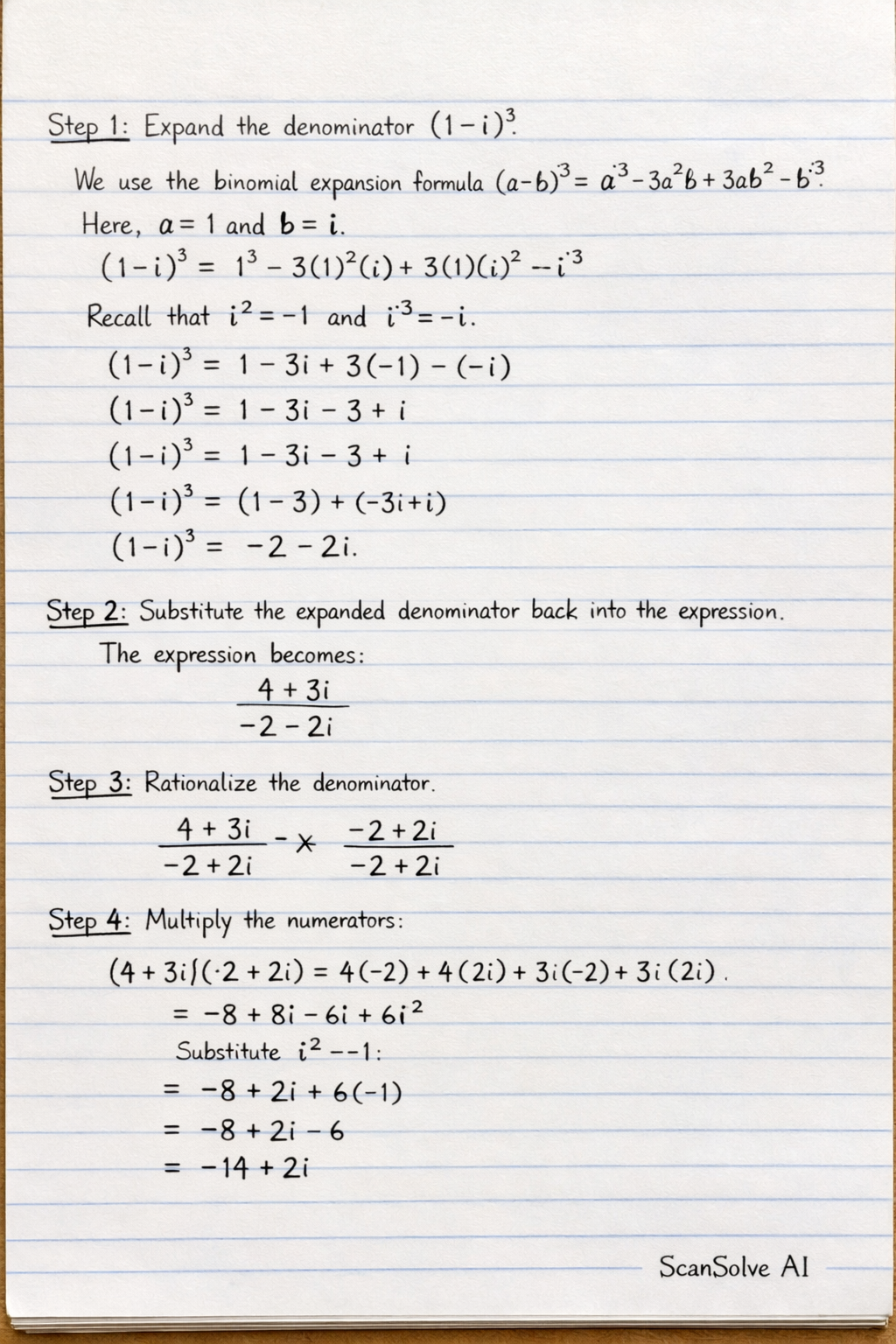 Recall that i2=−1 and i3=i2⋅i=(−1)i=−i.
