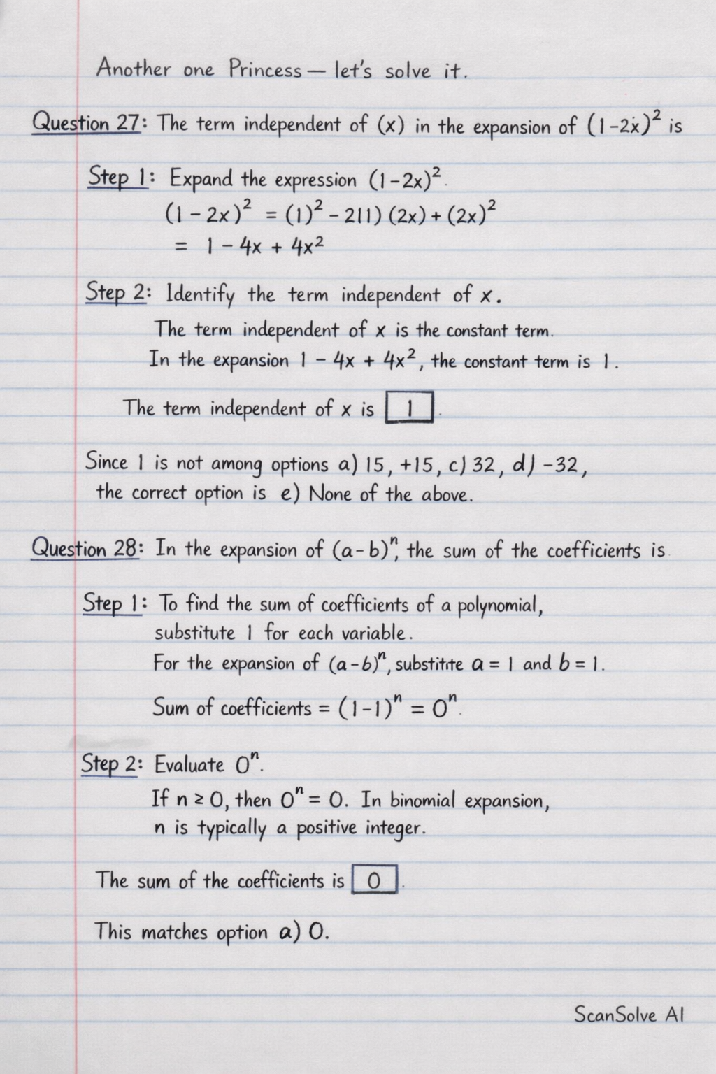 Question 27: The term independent of (x) in the expansion of (1β2x)2 is