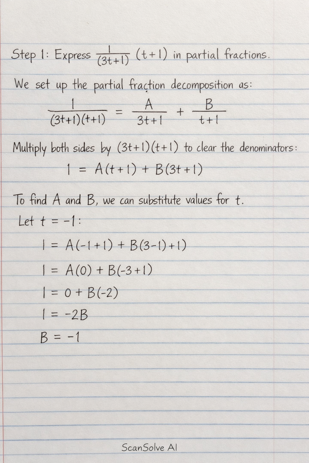 Express (1)/((3t+1)(t+1)) in partial fractions.