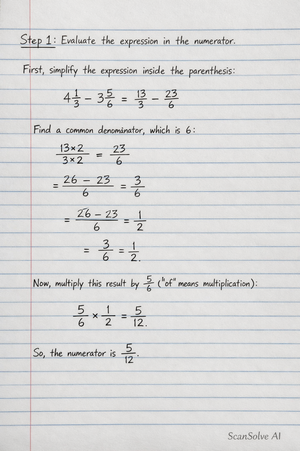 Step 1: Evaluate the expression in the numerator. First, simplify the expression inside the parenthesis: Find a common denominator, which is : Now, multiply this result by ("of" means multiplication): So, the numerator is .