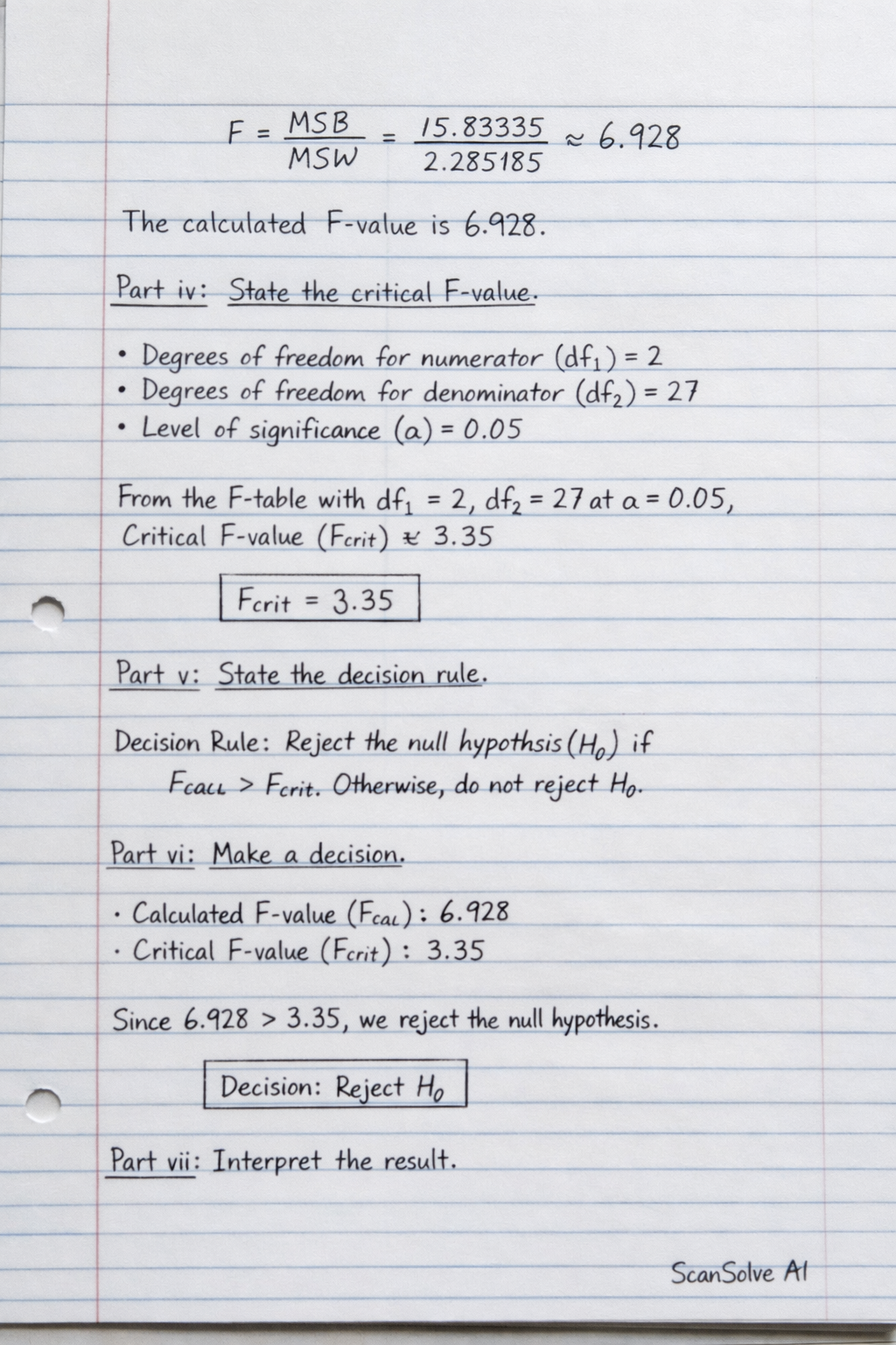 F = (MSB)/(MSW) = (15.83335)/(2.285185) ≈ 6.928 The calculated F-value is 6.928. Part iv: State the critical F-value.