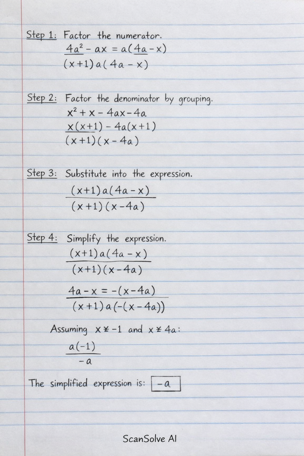 Assuming x=−1 and x=4a, we can cancel out the common factors (x+1) and (x−4a):