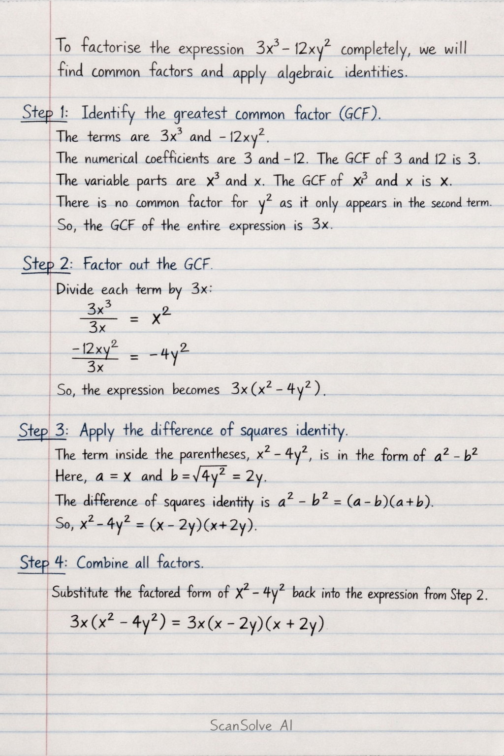 To factorise the expression 3x3−12xy2 completely, we will find common factors and apply algebraic identities.