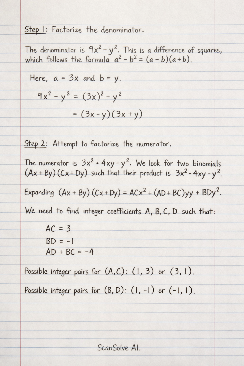 The numerator is 3x2−4xy−y2. We look for two binomials (Ax+By)(Cx+Dy) such that their product is 3x2−4xy−y2.