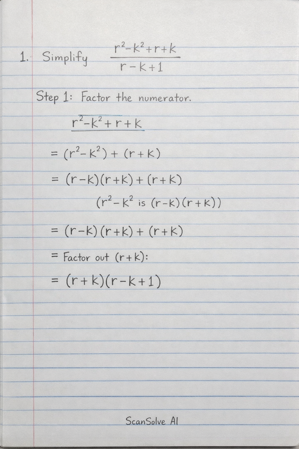 1. Using factorization by grouping, simplify r−k+1r2−k2+r+k