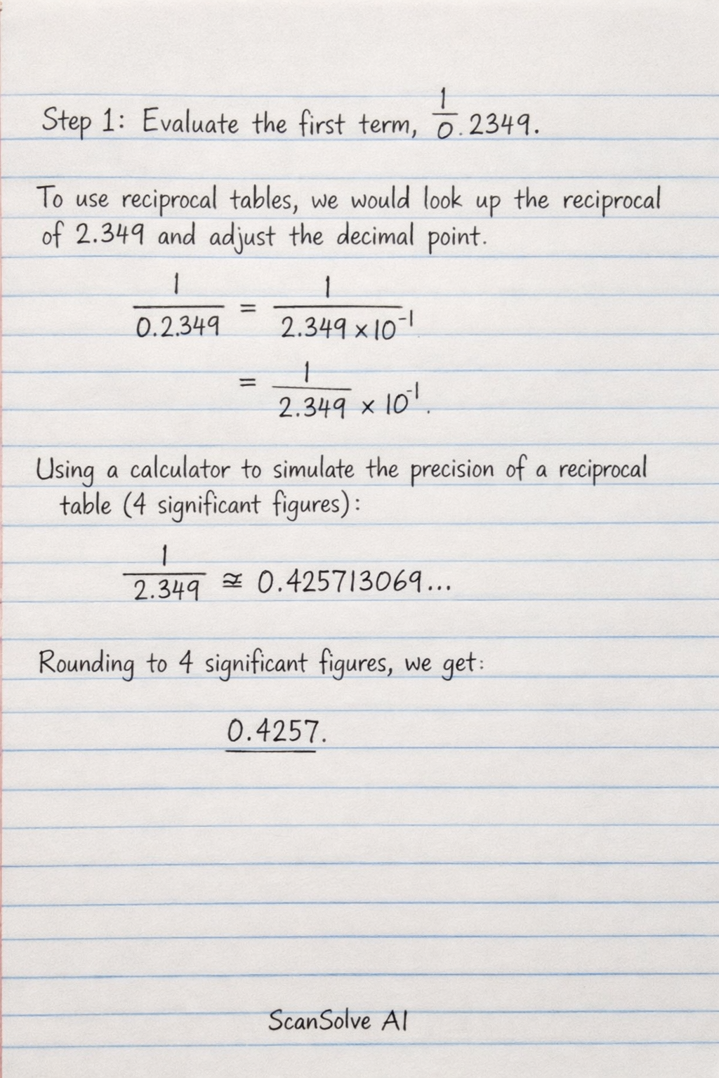 Evaluate the first term, (1)/(0.2349). To use reciprocal tables, we would typically look up the reciprocal of 2.349 and adjust the decimal point.