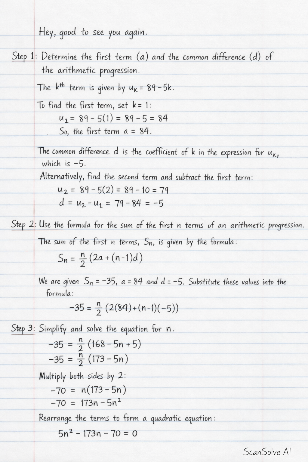 Hey, good to see you again. Step 1: Determine the first term (a) and the common difference (d) of the arithmetic progression.
