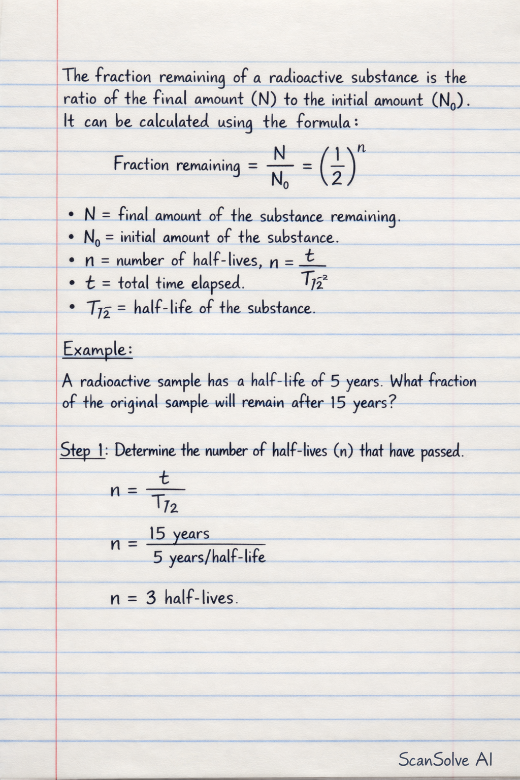 A radioactive sample has a half-life of 5 years. What fraction of the original sample will remain after 15 years?