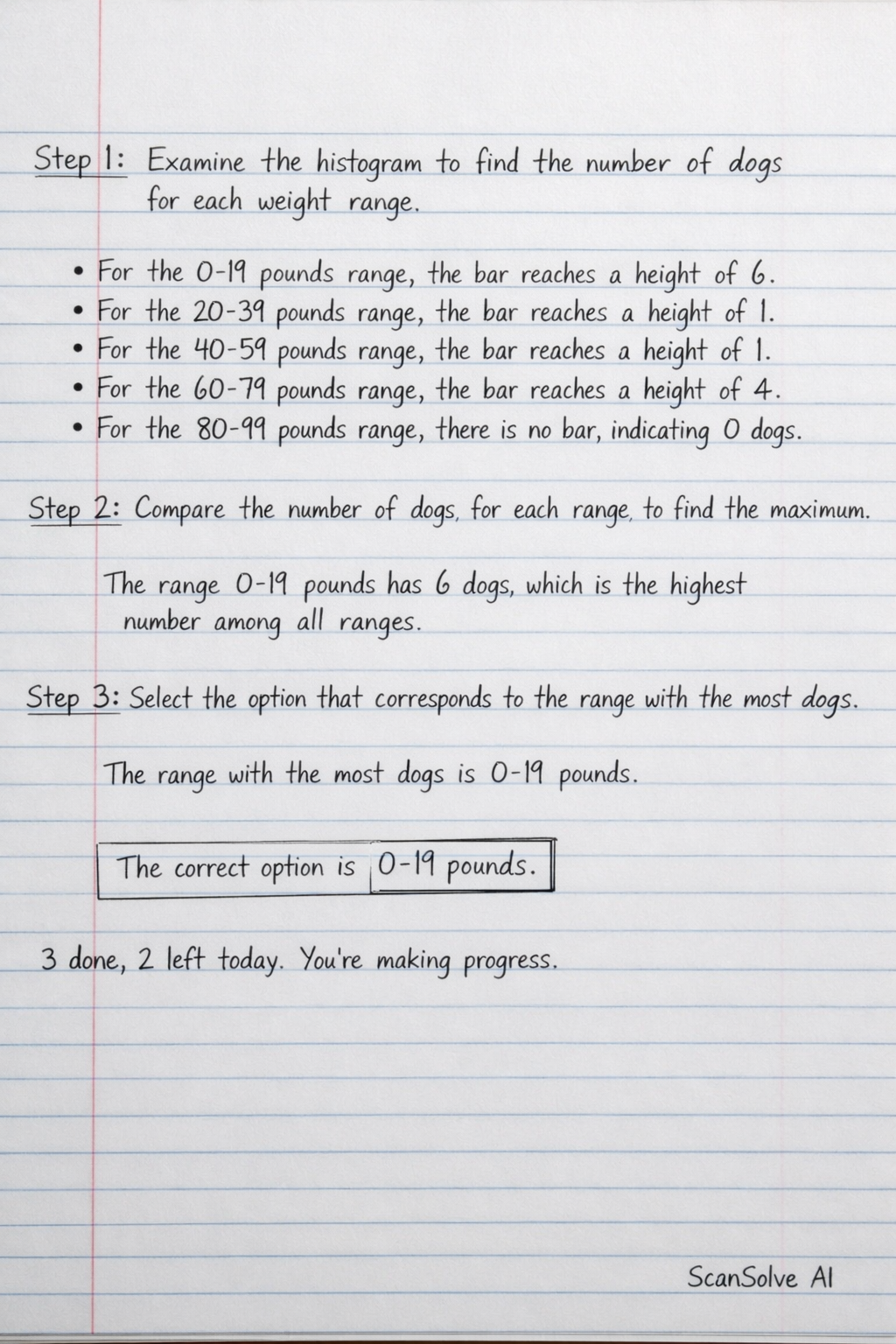 Step 1: Examine the histogram to find the number of dogs for each weight range.
