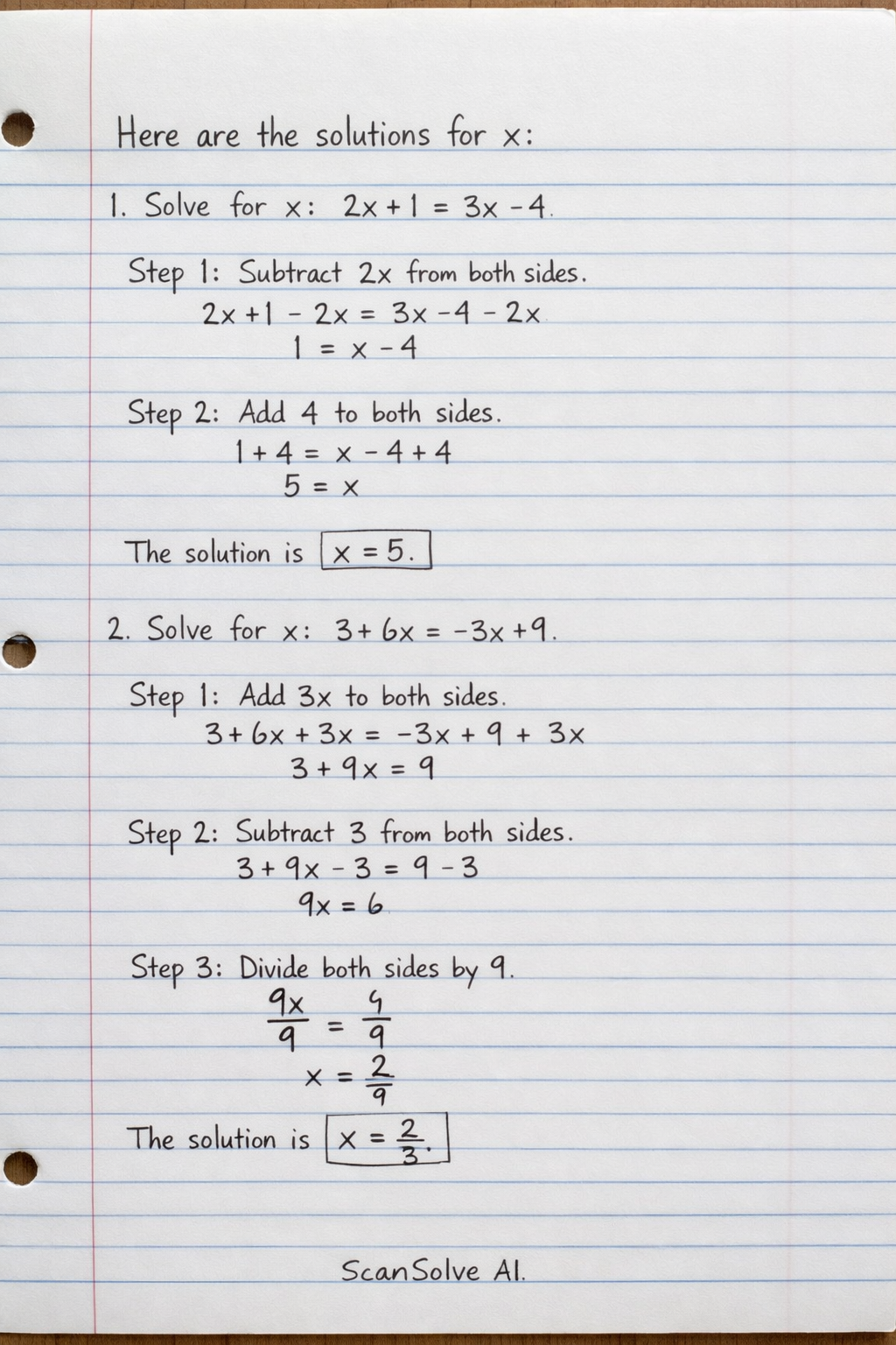 1. Solve for x: 2x+1=3x-4 Step 1: Subtract 2x from both sides of the equation.
