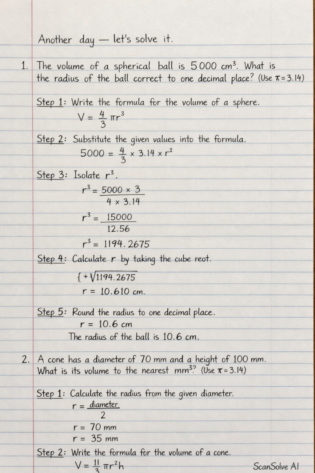 1. The volume of a spherical ball is 5,000cm3. What is the radius of the ball correct to one decimal place? (Use Ο=3.14)
