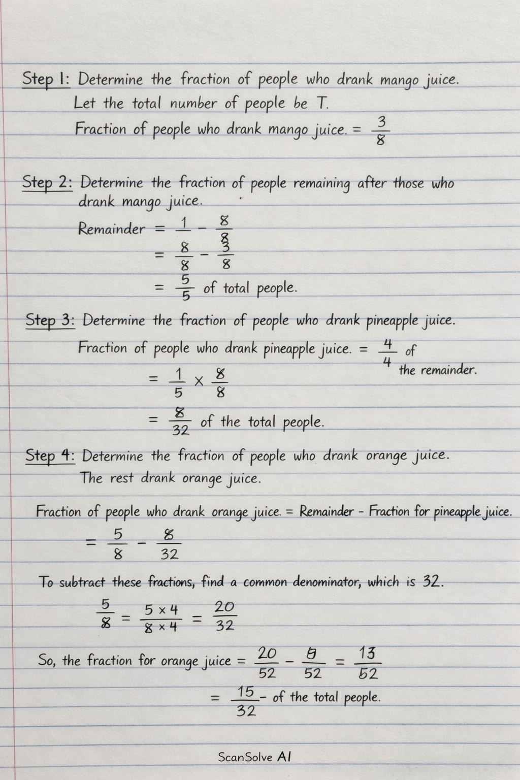 Fraction of people who drank orange juice =Remainder−Fraction for pineapple juice