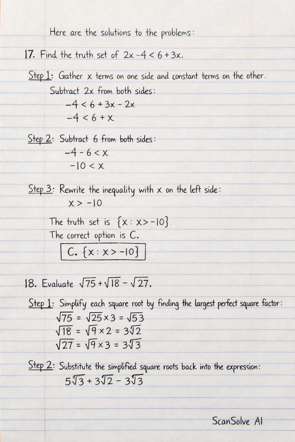 17. Find the truth set of $2x - 4 < 6 + 3x$.