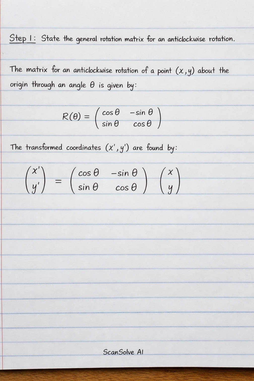 Step 1: State the general rotation matrix for an anticlockwise rotation.