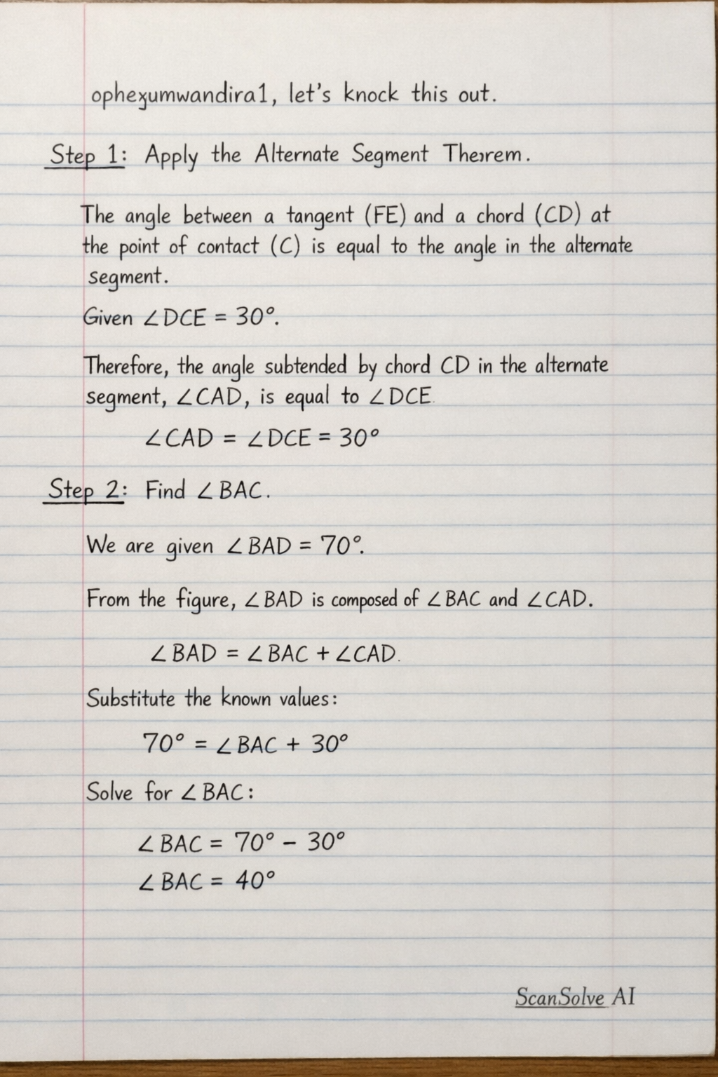 Therefore, the angle subtended by chord CD in the alternate segment, ∠CAD, is equal to ∠DCE.