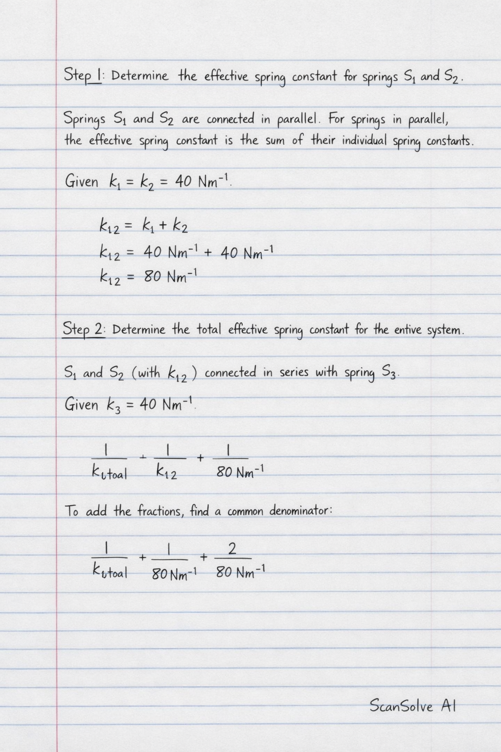 Step 2: Determine the total effective spring constant for the entire system. The combination of and (with effective constant ) is connected in series with spring . For springs in series, the reciprocal of the total effective spring constant is the sum of the reciprocals of the individual spring constants. Given . To add the fractions, find a common denominator: