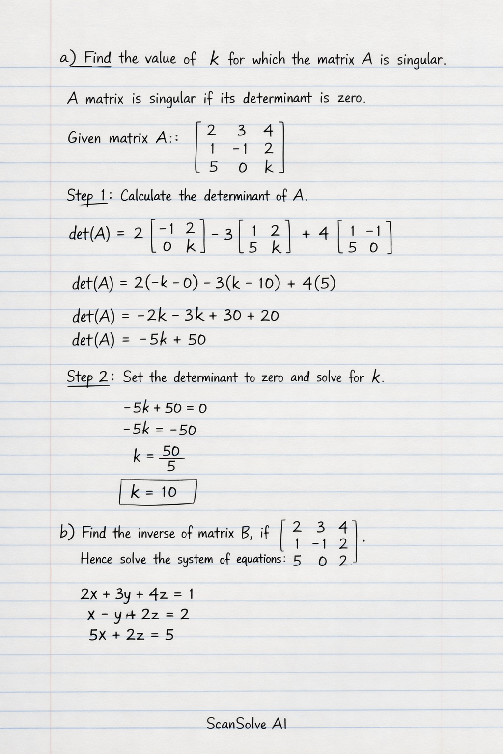 You're on a roll — a) Find the value of the constant k for which the matrix A is singular. A matrix is singular if its determinant is zero. Given matrix A: A = 2 & 3 & 4 \\ 1 & -1 & 2 \\ 5 & 0 & k Step 1: Calculate the determinant of A. (A) = 2 -1 & 2 \\ 0 & k - 3 1 & 2 \\ 5 & k + 4 1 & -1 \\ 5 & 0 (A) = 2((-1)(k) - (2)(0)) - 3((1)(k) - (2)(5)) + 4((1)(0) - (-1)(5)) (A) = 2(-k - 0) - 3(k - 10) + 4(0 - (-5)) (A) = -2k - 3k + 30 + 20 (A) = -5k + 50 Step 2: Set the determinant to zero and solve for k. -5k + 50 = 0 -5k = -50 k = (-50)/(-5) k = 10 k=10 b) Find the inverse of matrix B, if B = 2 & 3 & 4 \\ 1 & -1 & 2 \\ 5 & 0 & 2 . Hence solve the system of equations: 2x + 3y + 4z = 1 x - y + 2z = 2 5x + 2z = 5 Step 1: Calculate the determinant of B. (B) = 2 -1 & 2 \\ 0 & 2 - 3 1 & 2 \\ 5 & 2 + 4 1 & -1 \\ 5 & 0 (B) = 2((-1)(2) - (2)(0)) - 3((1)(2) - (2)(5)) + 4((1)(0) - (-1)(5)) (B) = 2(-2 - 0) - 3(2 - 10) + 4(0 - (-5)) (B) = 2(-2) - 3(-8) + 4(5) (B) = -4 + 24 + 20 (B) = 40 Step 2: Calculate the matrix of cofactors, C. C_11 = -1 & 2 \\ 0 & 2 = -2 C_12 = - 1 & 2 \\ 5 & 2 = -(2 - 10) = 8 C_13 = 1 & -1 \\ 5 & 0 = 0 - (-5) = 5 C_21 = - 3 & 4 \\ 0 & 2 = -(6 - 0) = -6 C_22 = 2 & 4 \\ 5 & 2 = 4 - 20 = -16 C_23 = - 2 & 3 \\ 5 & 0 = -(0 - 15) = 15 C_3