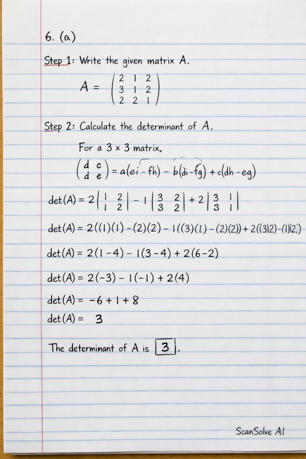 det(A)=21221−13221+23212det(A)=2((1)(1)−(2)(2))−1((3)(1)−(2)(2))+2((3)(2)−(1)(2))det(A)=2(1−4)−1(3−4)+2(6−2)det(A)=2(−3)−1(−1)+2(4)det(A)=−6+1+8det(A)=3