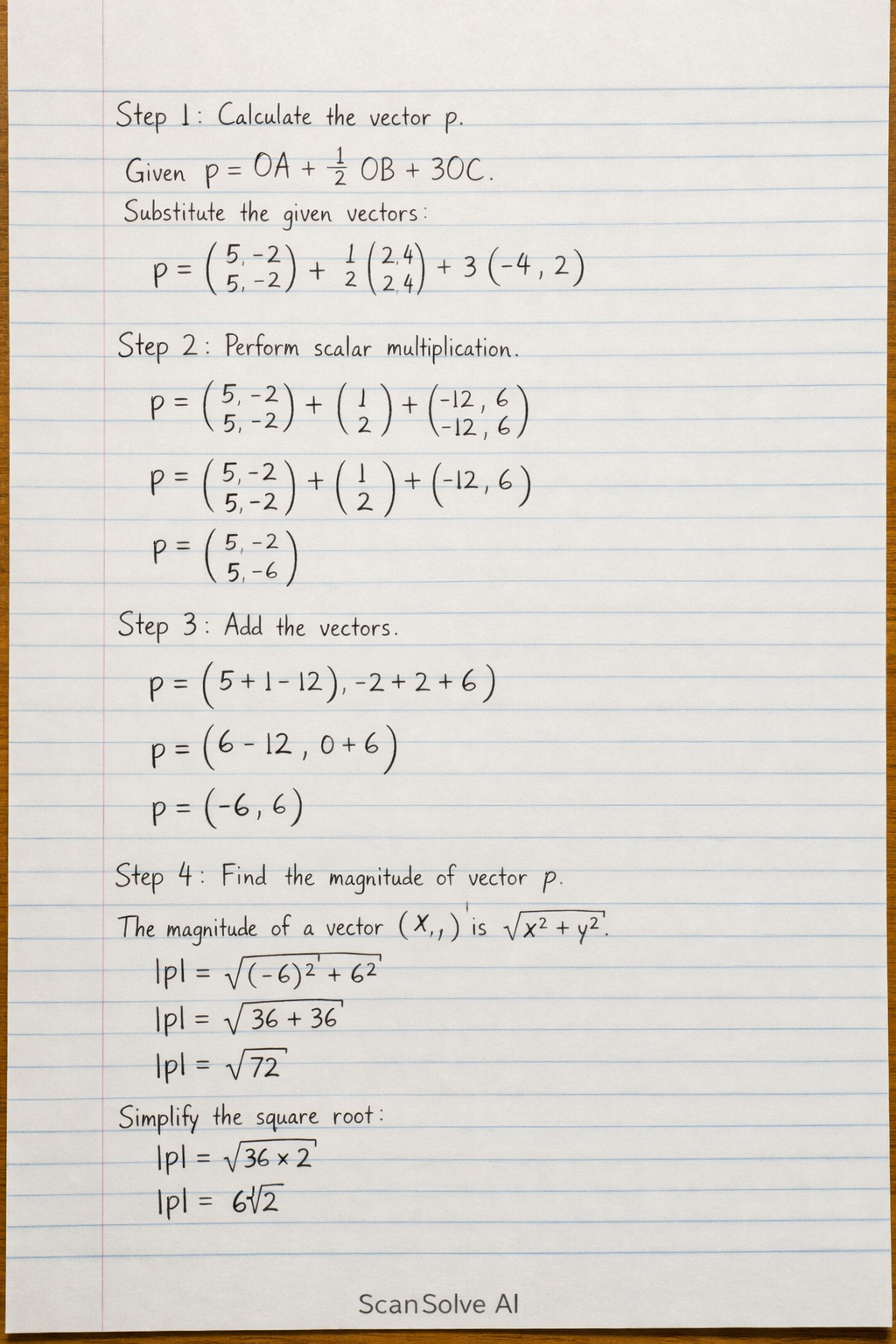 $$p = \begin{pmatrix} 5 \\ -2 \end{pmatrix} + \begin{pmatrix} \frac{1}{2} \times 2 \\ \frac{1}{2} \times 4 \end{pmatrix} + \begin{pmatrix} 3 \times -4 \\ 3 \times 2 \end{pmatrix}$$