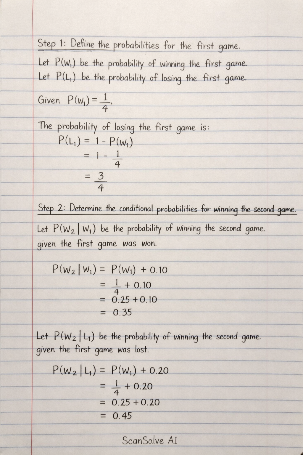 P(W2∣L1)=P(W1)+0.20=41+0.20=0.25+0.20=0.45