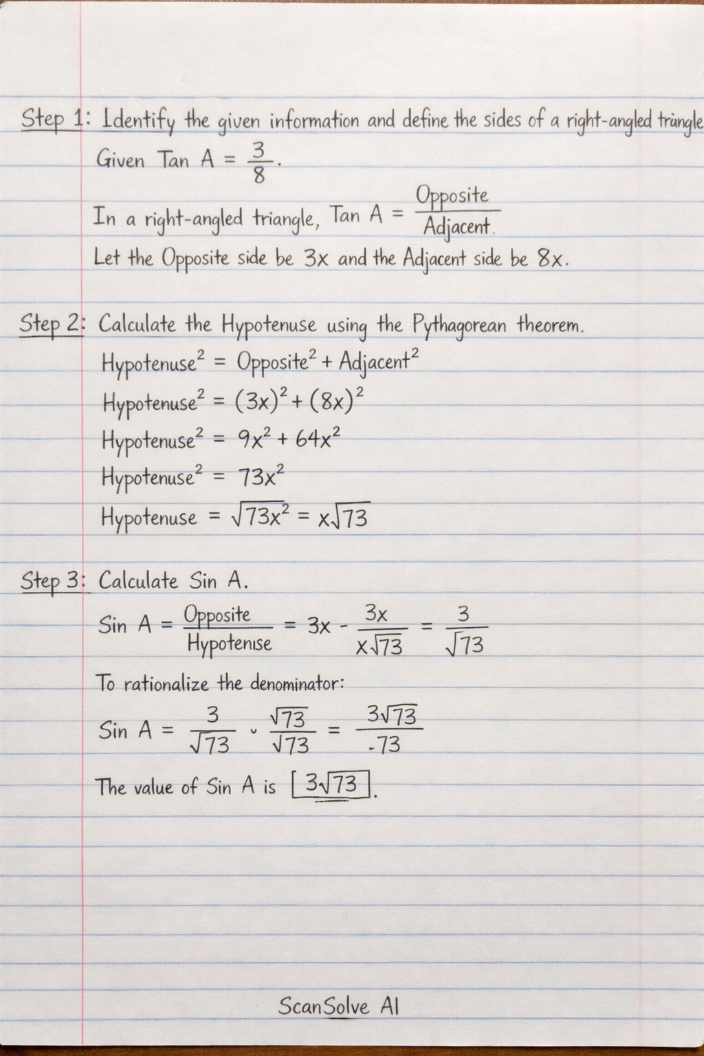 $$ \text{Sin A} = \frac{3}{\sqrt{73}} \times \frac{\sqrt{73}}{\sqrt{73}} = \frac{3\sqrt{73}}{73} $$