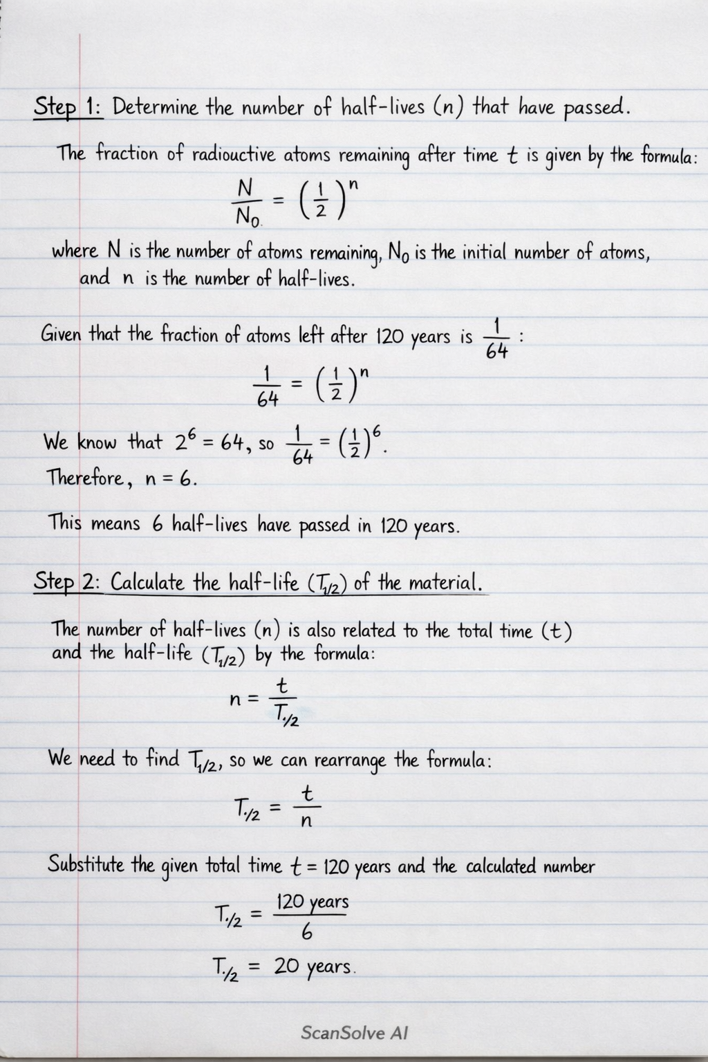 Substitute the given total time t=120 years and the calculated number of half-lives n=6: