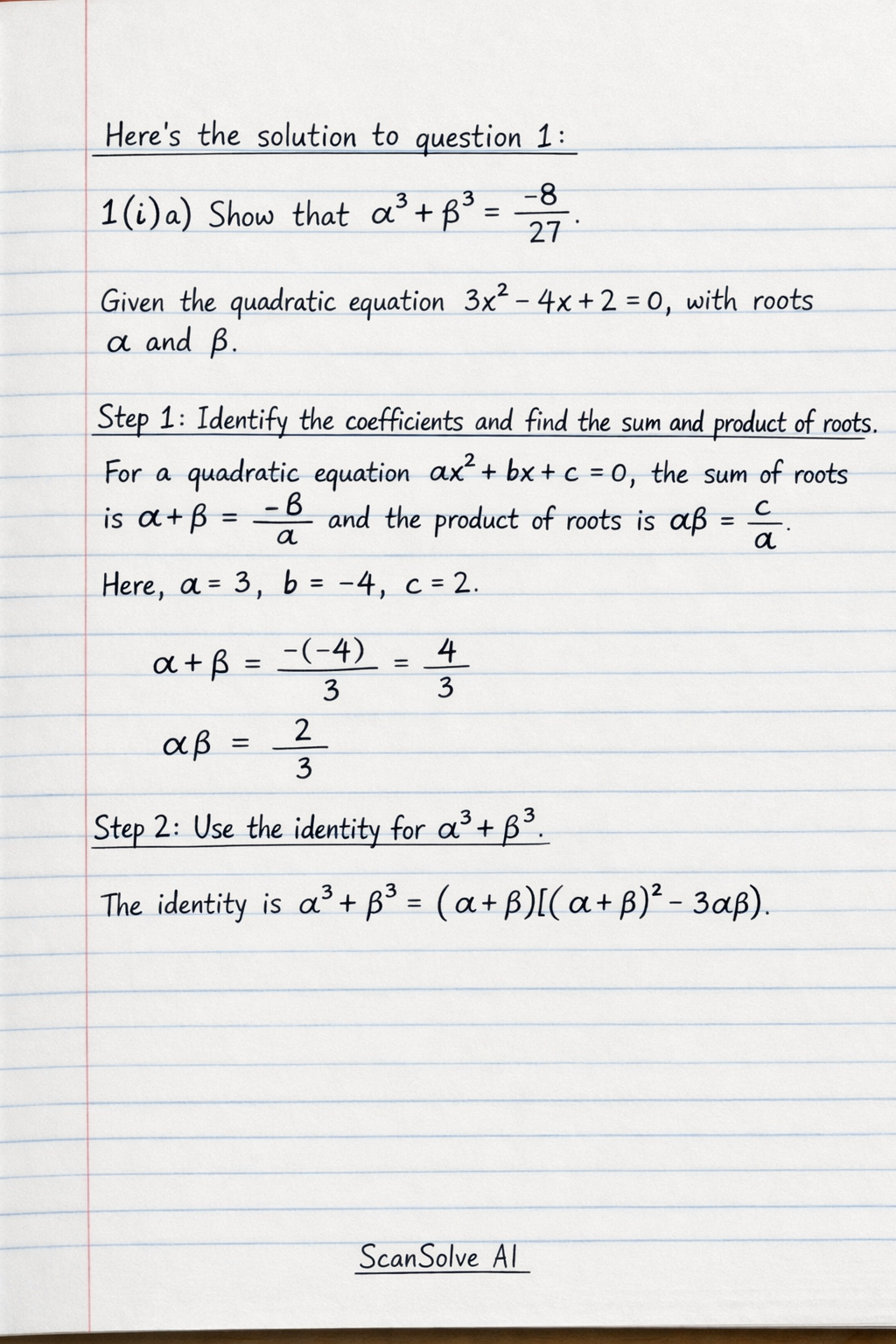 1(i)a) Show that $\alpha^3 + \beta^3 = -\frac{8}{27}$