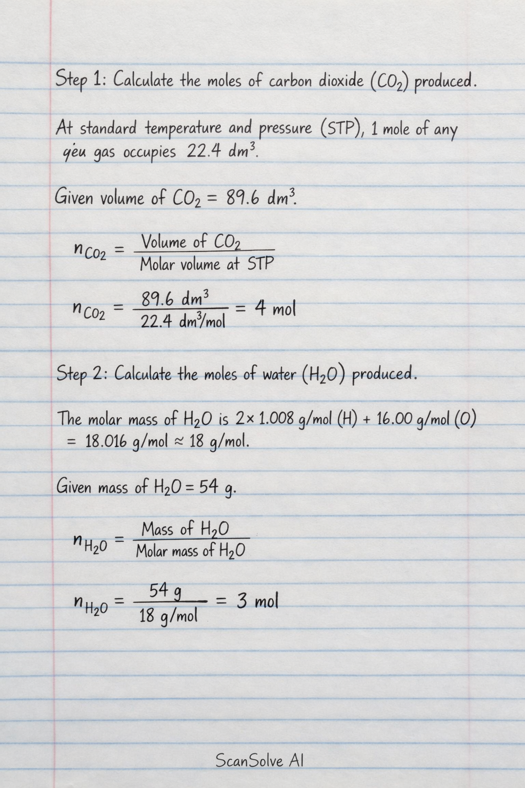 Step 2: Calculate the moles of water (H2O) produced.