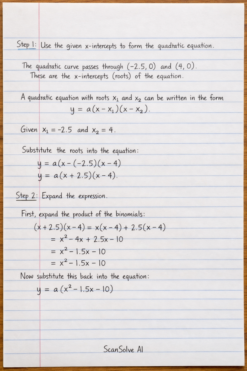 Step 1: Use the given x-intercepts to form the quadratic equation.