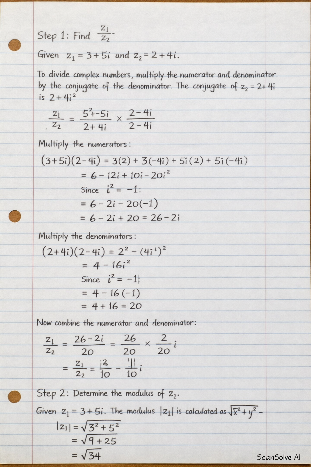 \frac{z_1{z_2} = \frac{13}{10} - \frac{1}{10}i}∣z1∣=34\arg(z_1) = \arctan\left(\frac{5{3}\right) \approx 59.04^\circ or 1.03 radians}