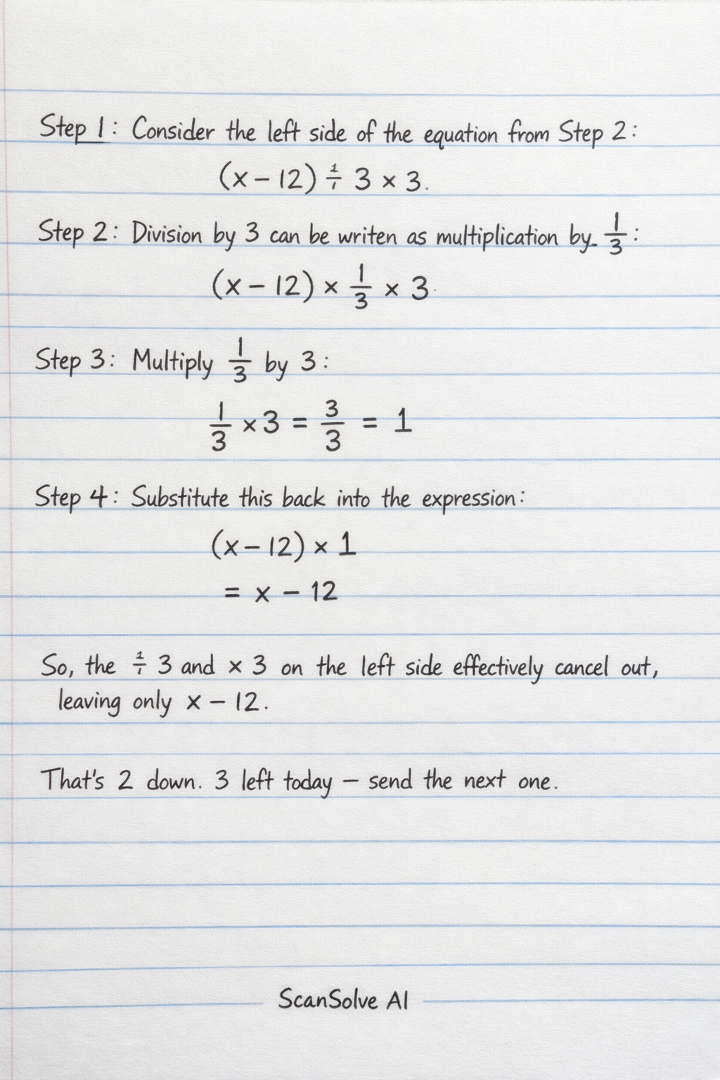 When you have (x−12)÷3×3, the operations of dividing by 3 and then multiplying by 3 are inverse operations. They cancel each other out.