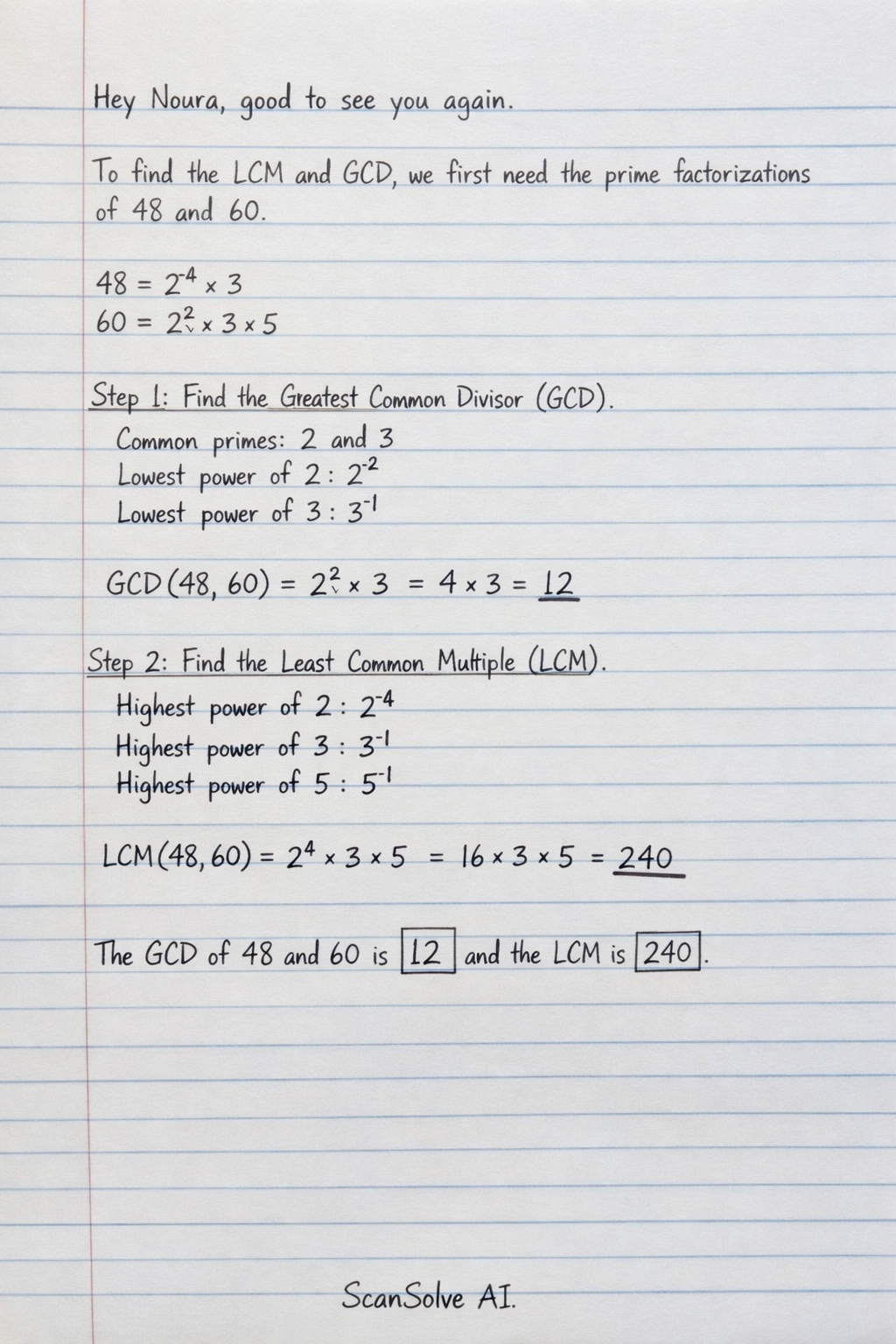 Hey Noura, good to see you again. To find the LCM and GCD, we first need the prime factorization of 48 and 60.