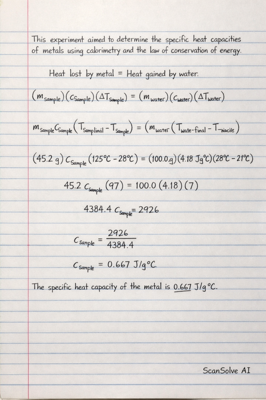 The core principle relies on the assumption that the heat lost by the metal sample is equal to the heat gained by the water. Therefore, (msample)(csample)(ΔTsample)=(mwater)(cwater)(ΔTwater). By measuring the masses and temperature changes of both the metal and water, and knowing the specific heat of water (cwater), the specific heat of the metal (csample) can be calculated.