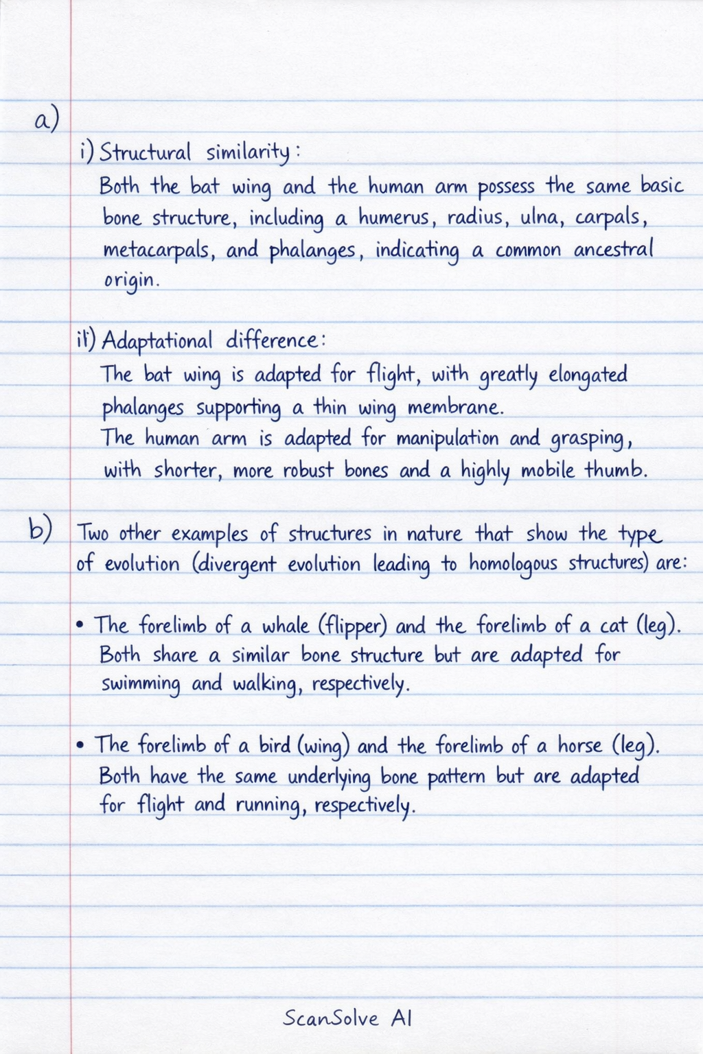 ii) Adaptational difference: The bat wing is adapted for flight, with greatly elongated phalanges supporting a thin wing membrane. The human arm is adapted for manipulation and grasping, with shorter, more robust bones and a highly mobile thumb.