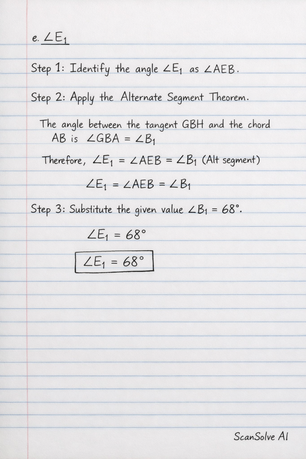 Step 2: Apply the Alternate Segment Theorem. The angle between the tangent $GBH$ and the chord $AB$ is $\angle GBA = \angle B_1$. This angle is equal to the angle in the alternate segment, which is $\angle AEB$.