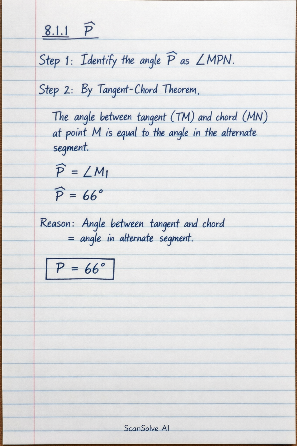 8.1.1 Step 1: Identify the angle as . Step 2: Apply the Tangent-Chord Theorem. The angle between a tangent (TM) and a chord (MN) through the point of contact (M) is equal to the angle in the alternate segment subtended by the chord. Reason: Angle between tangent and chord is equal to the angle in the alternate segment.