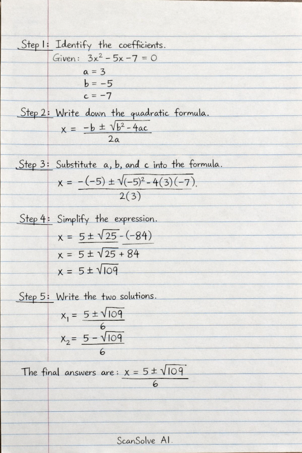 $$x = \frac{-(-5) \pm \sqrt{(-5)^2 - 4(3)(-7)}}{2(3)}$$