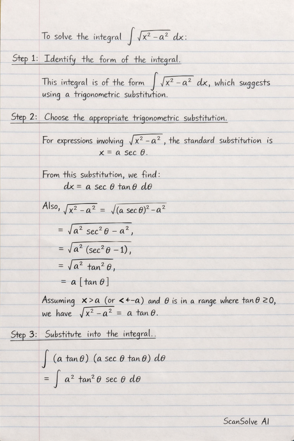 For expressions involving x2−a2, the standard substitution is x=asecθ.