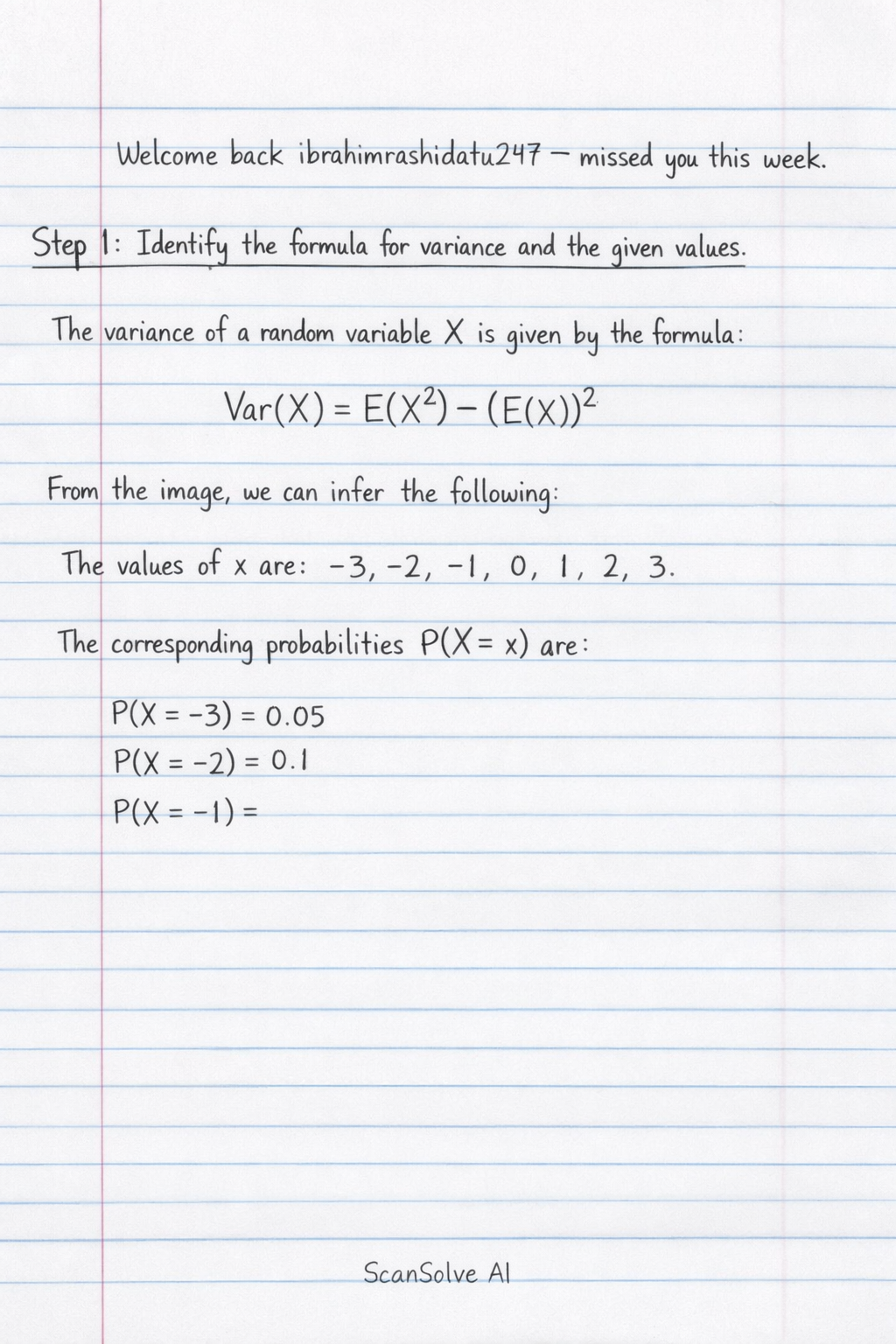 Welcome back ibrahimrashidatu247 — missed you this week. Step 1: Identify the formula for variance and the given values.